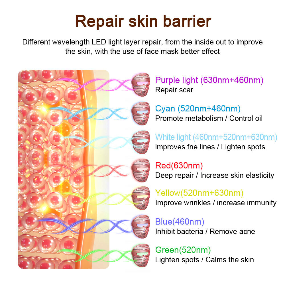 Αυτή η συσκευή διαθέτει επτά διαφορετικές πηγές ψυχρού φωτός — κόκκινο, πράσινο, μπλε, μοβ, κίτρινο, κυανό και λευκό. Κάθε φως προσφέρει μοναδικά οφέλη και στοχεύει σε συγκεκριμένα προβλήματα του δέρματος. Με μία πολύπλευρη συσκευή, οι χρήστες μπορούν να απολαύσουν πολλαπλά οφέλη για τη φροντίδα του δέρματος, κάνοντάς την πρακτική και οικονομική.